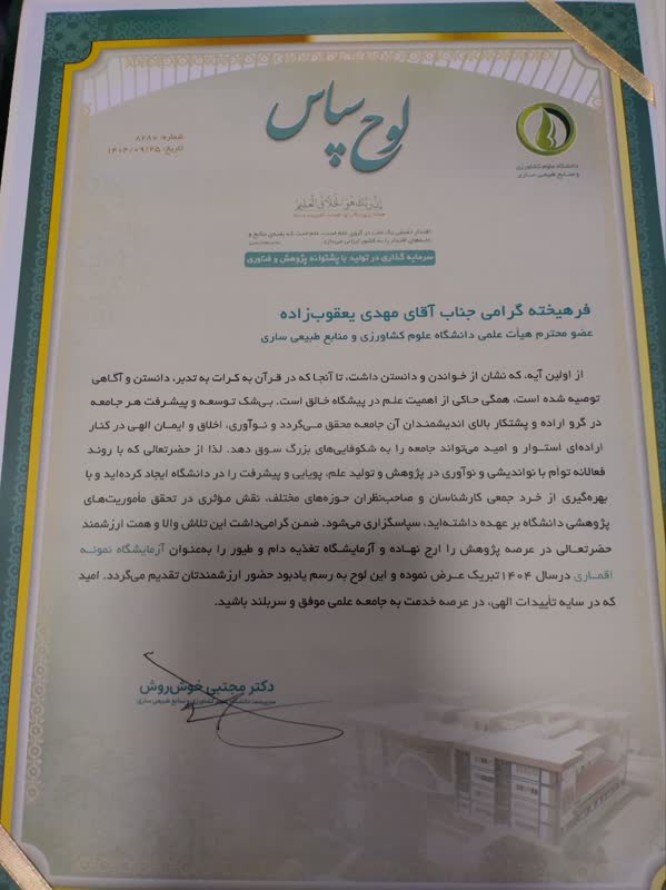 به همین مناسبت در مراسم هفته ی پژوهش از آقای مهندس یعقوب زاده تقدیر و تشکر بعمل آمد.